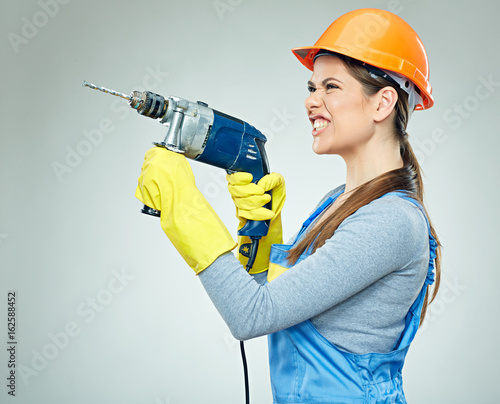 Hard work of woman builder with drill tool.