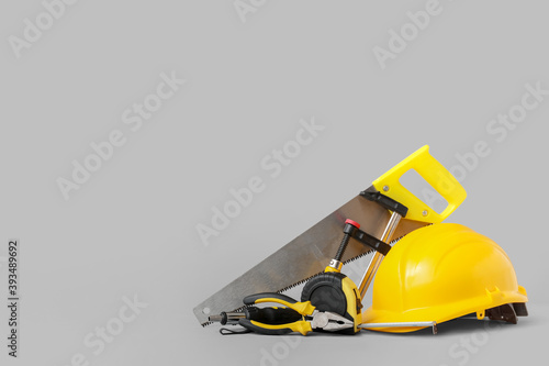 Hardhat and construction tools on grey background