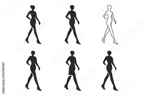 Harmonious Logo Variations. Model posing. Set Logo of model posing: Runway figure. harmonious logo variations of the same emblematic concept (Stylized detail,