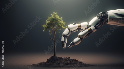Harmony of Nature and Technology: Robot hand delicately cradles a young sapling green tree plant. A futuristic embrace of growth and sustainability.