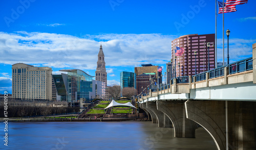 Hartford, Connecticut downtown city skyline with the Bulkeley Bridge spanning the Connecticut River, an iconic historic modern architecture in New England.