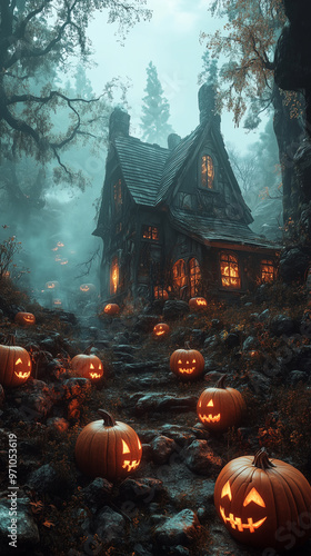 Haunted Halloween House Surrounded by Jack-o'-Lanterns on the Pathway