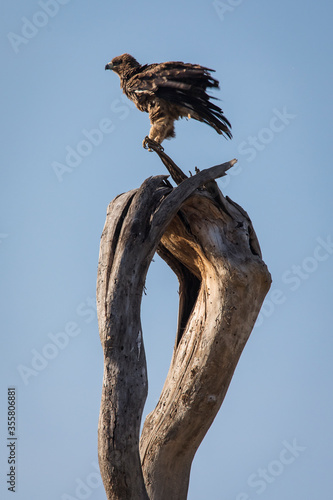 Hawk resting on a tree in Serengeti National Park in Tanzania during safari with blue sky in background