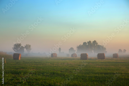 haystack on green field under the beautiful blue cloudy sky at sunrise. foggy morning. summer (spring) landscape