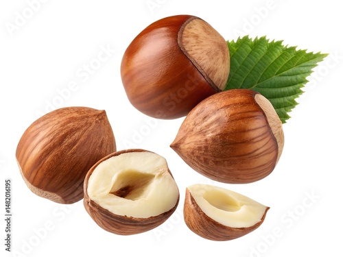 Hazelnut isolated on transparent background. A close up of a hazelnut with a leaf. The hazelnut is partially opened and has a white center.