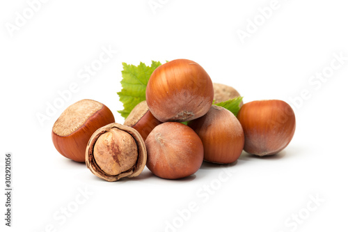 Hazelnut nut many leaves isolated on a white background as a packaging design element