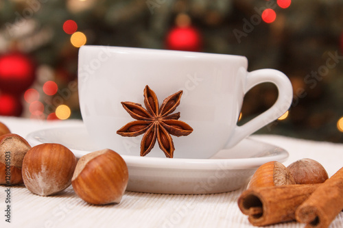 Hazelnuts, spices, cup of coffee or tea and christmas tree with lights in background