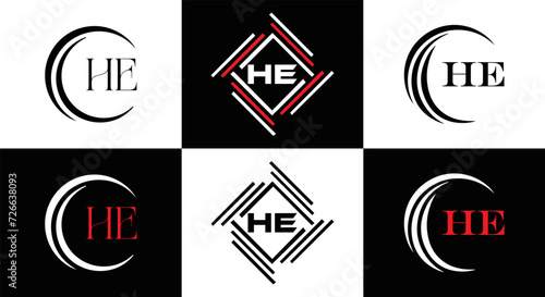 HE logo. H E design. White HE letter. HE, H E letter logo SET design. Initial letter EE linked circle uppercase monogram logo. H E letter logo SET vector design. HE letter logo design
