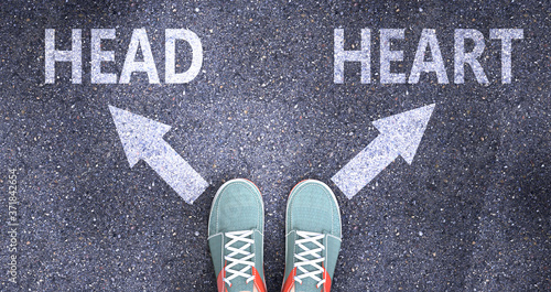 Head and heart as different choices in life - pictured as words Head, heart on a road to symbolize making decision and picking either Head or heart as an option, 3d illustration