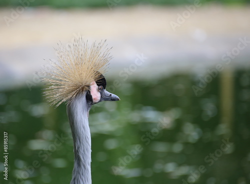 Head of a grey crowned crane (Balearica regulorum) with speckled blurry background