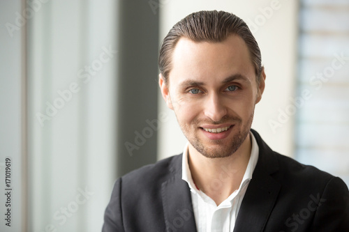 Head shot portrait of smiling handsome successful businessman. Young project manager, CEO looking at camera, positive attitude during job interview or business meeting, corporate representative.
