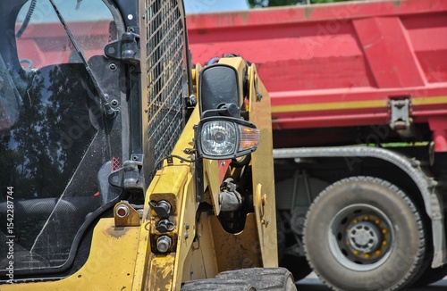 Headlight of a mini loader close up with a blurry truck in the background. selective focus of construction equipment
