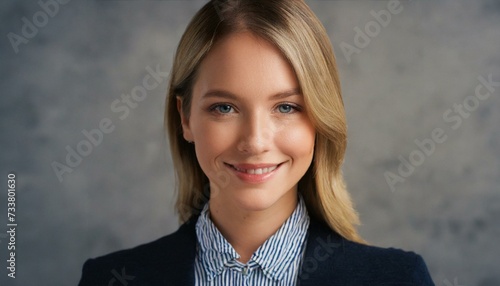 Headshot of a beautiful blond smiling young woman looking at the camera on gray background