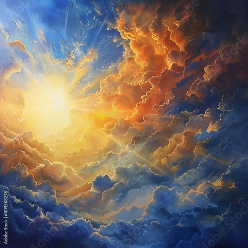 Healing sunset sky above clouds with warm yellow and blue hues, sunbursts, and ethereal sun rays
