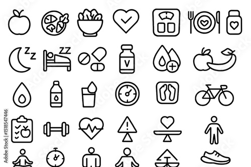 Health and wellness icons representing nutrition, exercise, and self-care practices for a holistic lifestyle