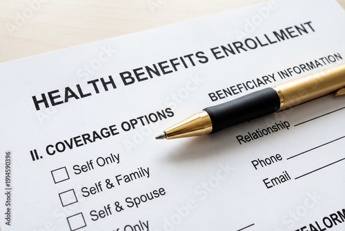 Health benefits enrollment document with gold pen resting on paper showing coverage options section
