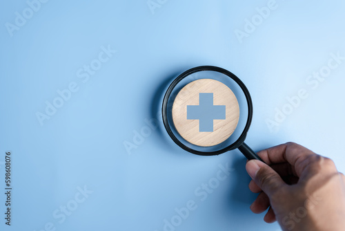 Health insurance healthcare medical concept. Hand people holding Magnifier focus to plus symbol icon, health and access to welfare health concept.