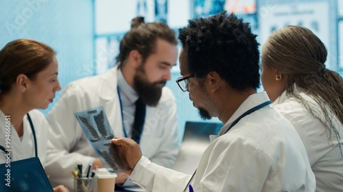 Healthcare experts team reviews x ray results to find best treatment plan, medical office meeting. Collaborative work with expertise in radiology and disease prevention, analytics control. Camera A.
