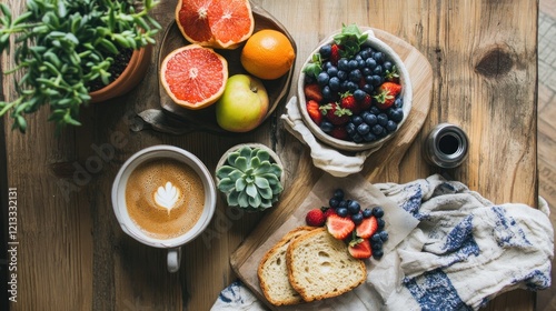 Healthy breakfast; fruit, coffee, bread; rustic table; blog post