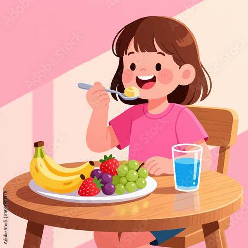 Healthy Breakfast: Girl Eating Fruit Salad with Banana and Grapes