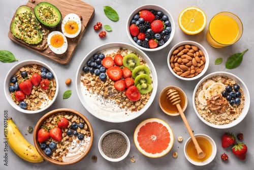 Healthy breakfast selection displayed on a smooth gray background with top view