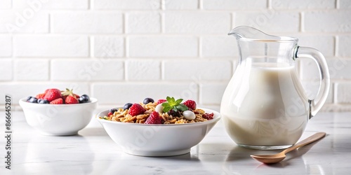 Healthy breakfast with granola, fresh berries and milk. Nutritious morning meal with bowl of crunchy granola cereal topped with juicy raspberries, blueberries and peach slices.
