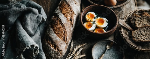 Healthy breakfast with minimal rustic style in kitchen concept. Delicious homemade bread and boiled eggs on a rustic table.