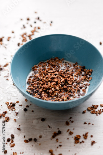 Healthy cereal breakfast. Sweet granola with milk in teal bowl on wooden background. Wholegrain vegetarian morning tasty food.