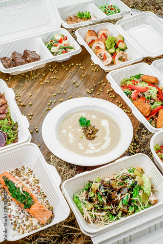 Healthy food delivery. Take away for diet. Fitness nutrition, vegetables, meat and fruits in white eco boxes. Top view, flat lay at natural wood with copy space
