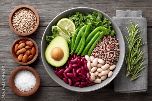 Healthy grain bowl with avocado, hummus, beans, and greens