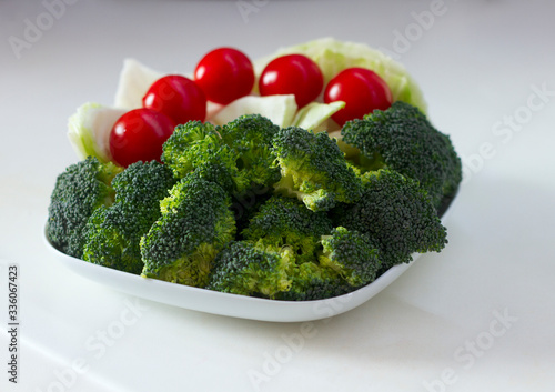 Healthy lifestyle concept: Vegetables (cabbage, tomato, broccoli) on a white plate on a white table