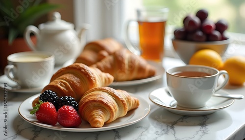 Healthy Morning Breakfast With Fresh Croissants Seasonal Fruits And Warm Hot Tea