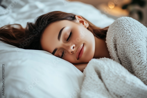 Healthy sleep concept, beautiful woman sleeping happily on bed at night. Generative Ai.