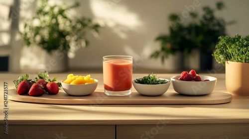 Healthy Smoothie Ingredients - Fresh strawberries, mango, raspberries, herbs and a vibrant smoothie in small bowls on a wooden board.