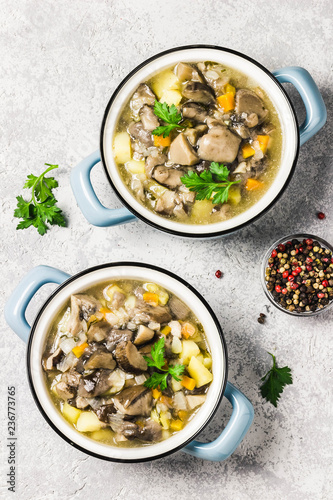 Healthy vegan wild mushroom soup in pots on grey concrete background. Top view, space for text.