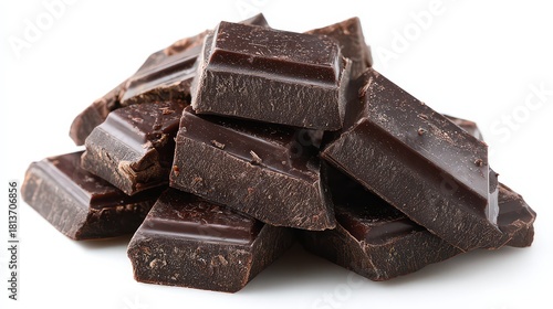 Heap of Dark Chocolate Chunks on White Background with Shiny Surface in Studio Lighting, Close Up View