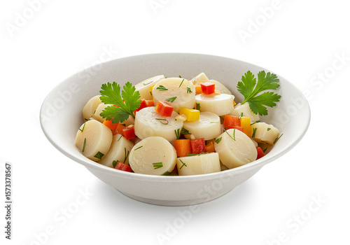 Heart of palm salad with colorful peppers and parsley in a white bowl on white background