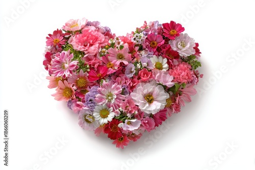 Heart shape from pink, red, and white colorful flowers isolated on white. Ideal for Valentine's day, wedding, or any loving occasion.