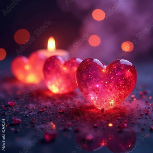 heart shaped candles on red background,creative Translucent slightly glowing from a variety of precious stones, shimmering 3D fantastic hearts, candle flame,bokeh,mysterious beautiful atmosphere