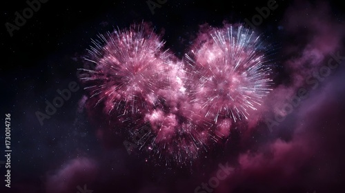 Heart shaped fireworks explode in a vibrant pink and purple display against a starry night sky