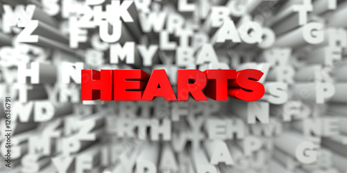 HEARTS - Red text on typography background - 3D rendered royalty free stock image. This image can be used for an online website banner ad or a print postcard.