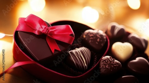 Heart-shaped chocolate box with red ribbon, glowing in candlelight, evokes romance and warmth.