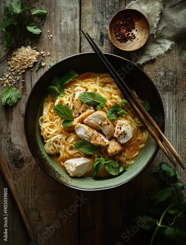 Hearty bowl of chicken noodles in a rich, flavorful sauce, garnished with fresh herbs. A comforting, Asian-inspired meal