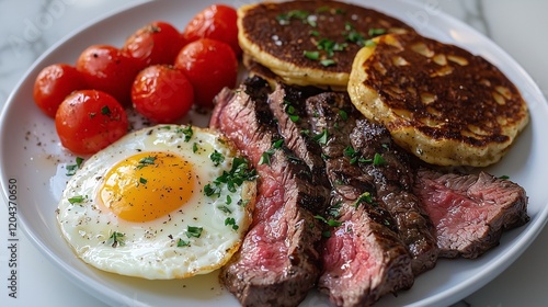 Hearty breakfast plate featuring steak, eggs, and homemade pancakes, perfect for a filling start