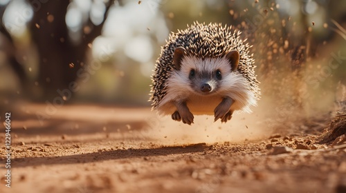 Hedgehog with a white spot on its face running down a dirt road