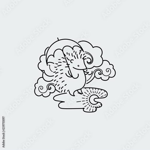 Hedgehog with an umbrella under the rainy cloud on puddle. Line image vector illustration for nursery art