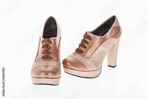 heeled shoes brown and bright pink with brown laces for women on white background