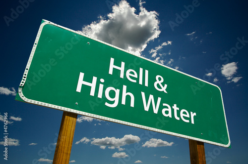 "Hell & High Water" Road Sign with dramatic blue sky and clouds.