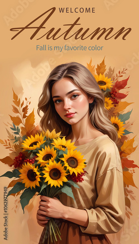 Hello Autumn poster with young woman with long blonde hair holding bouquet of flowers