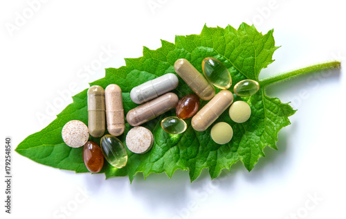 Herb supplement capsules on green leaf isolate on white background. Selective focus.
